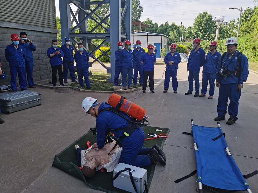 本次演練在公司安全總監侯國棟的一聲令下,演練拉開序幕,由公司應急救援隊組成的現場作業組、應急救援組、疏導警戒組、醫療救護組等4組演練人員開展救援工作,相繼展示了事故發生后的事故報告、現場秩序維護、氣體檢測、救援三腳架搭設、安全防護裝備佩戴、通風設備使用、人員救護等應急處置全過程。